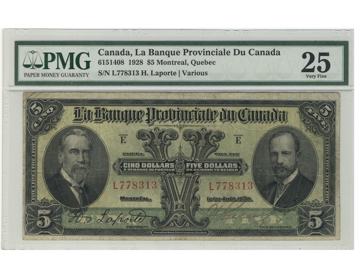 The Provincial Bank of Canada; 1928 $5 #L778313 CH- 615-14-08 PMG VF25.