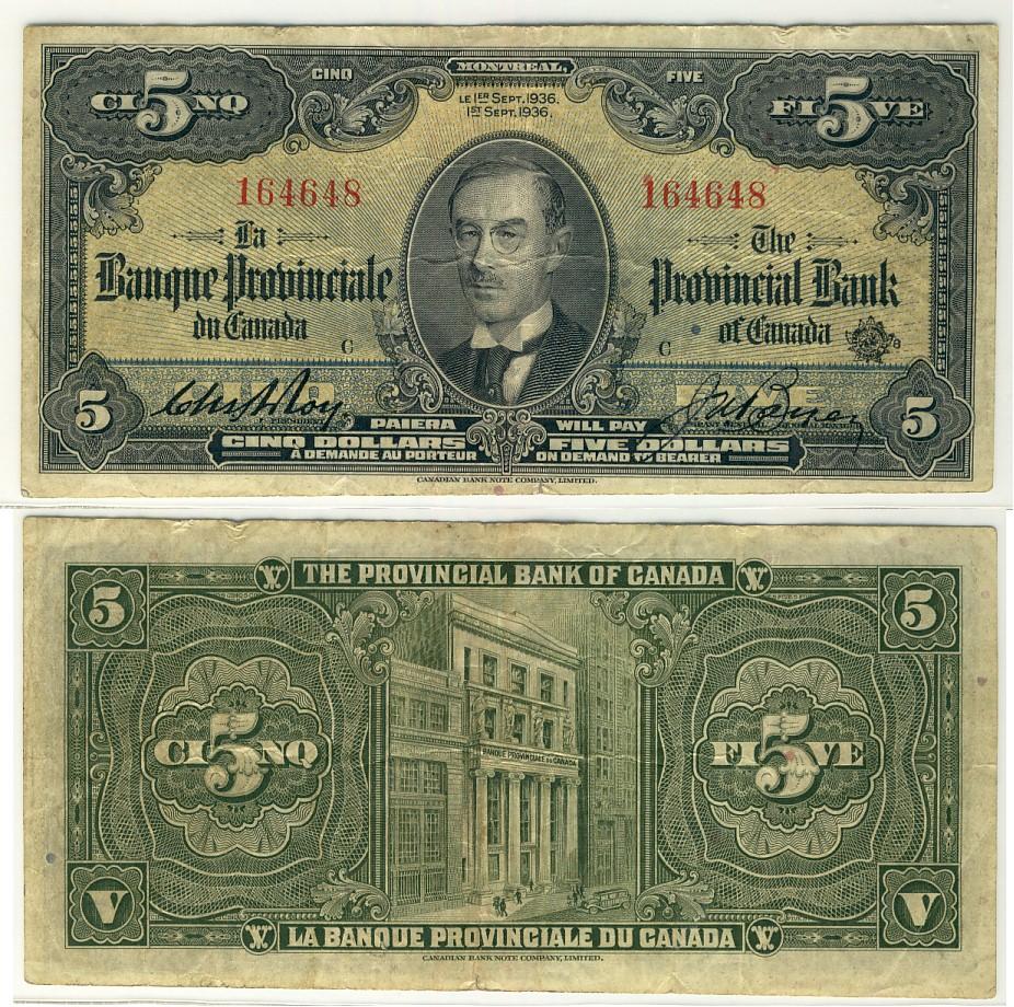 The Provincial Bank of Canada, 1936 $5 CH-615-18-04 #164648. Rare Green Back example. A nice about VF example with one very minor tear in bottom border.