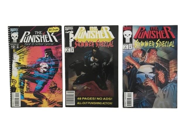 For sale is a unique trio of Punisher comics, perfect for fans of Frank Castle's more seasonal and thematic adventures. This lot includes two Punisher Summer Specials and one Punisher Back to School Special, offering a fun and different take on the classic vigilante.