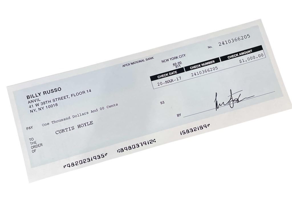 Original prop check used in the production of the Steve Lightfoot created television series 'The Punisher (2017-2019), where after his revenge on those who murdered his family, aimless Marine veteran Frank Castle finds a new meaning in life as a vigilante known as "The Punisher".