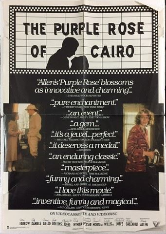 The Purple Rose of Cairo (Orion Pictures/Vestron Video, 1985). One Sheet. Director: Woody Allen. Starring: Mia Farrow and Jeff Daniels. There are fold lines, creases, marks, stains, paper loss and edge wear damage. Fine. (27" X 38.5").