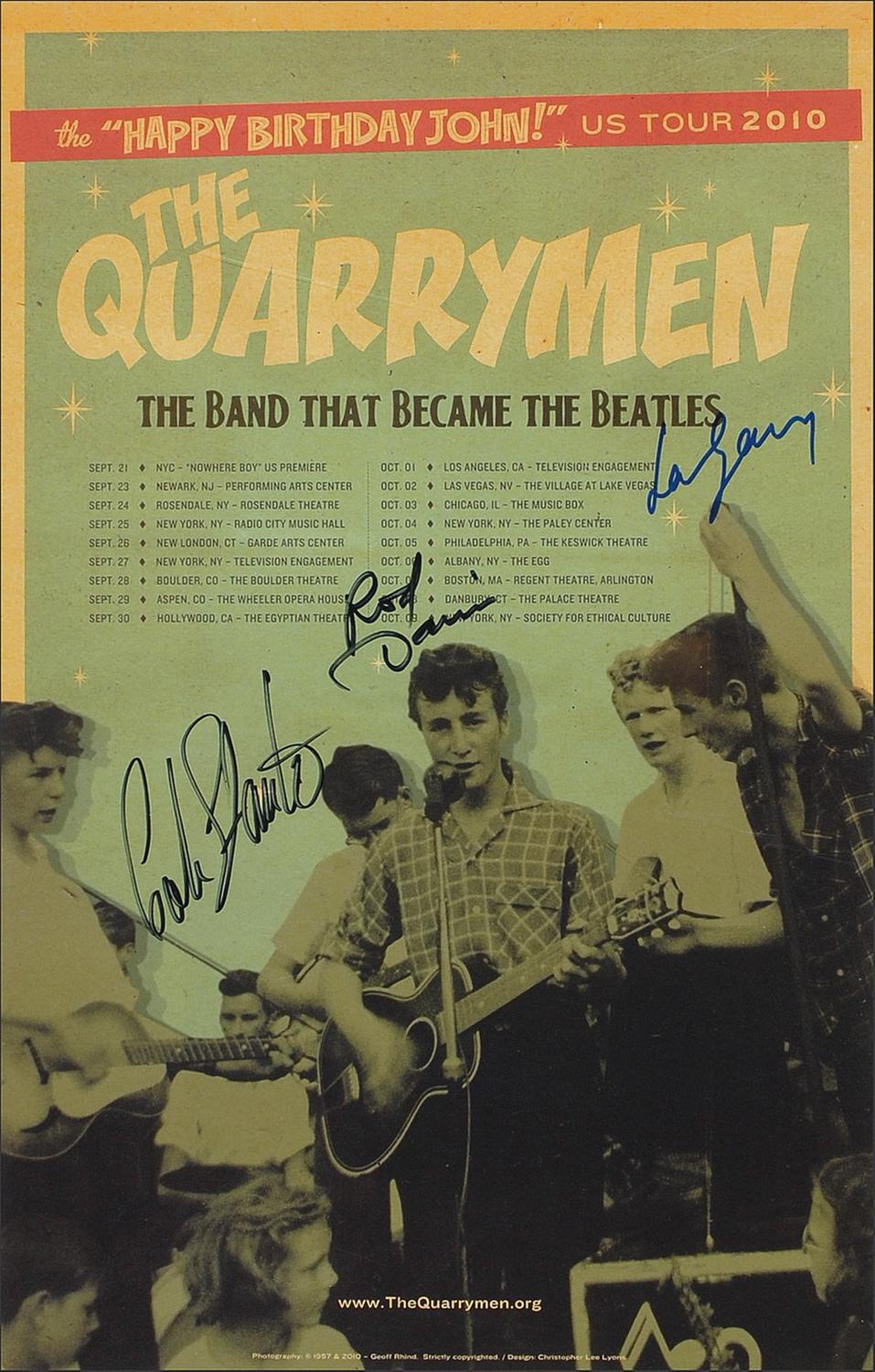 Color 11 x 17 mini-poster for their Happy Birthday John 2010 US Tour, signed in black felt tip by Rod Davis and Colin Hanton, and blue felt tip by Len Garry. In fine condition.