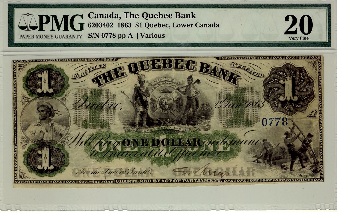 The Quebec Bank 1863 $1 0778 CH-620-34-02 PMG VF20, no town overprint. Excessively rare. Exceptional grade for type. Worth a premium bid.