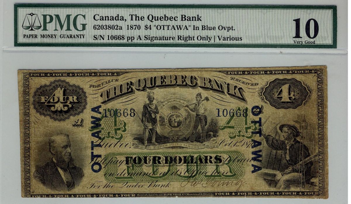 The Quebec Bank, 1870 $4 #10668, town o/p, Three Rivers, CH-620-38-02a, PMG VG10