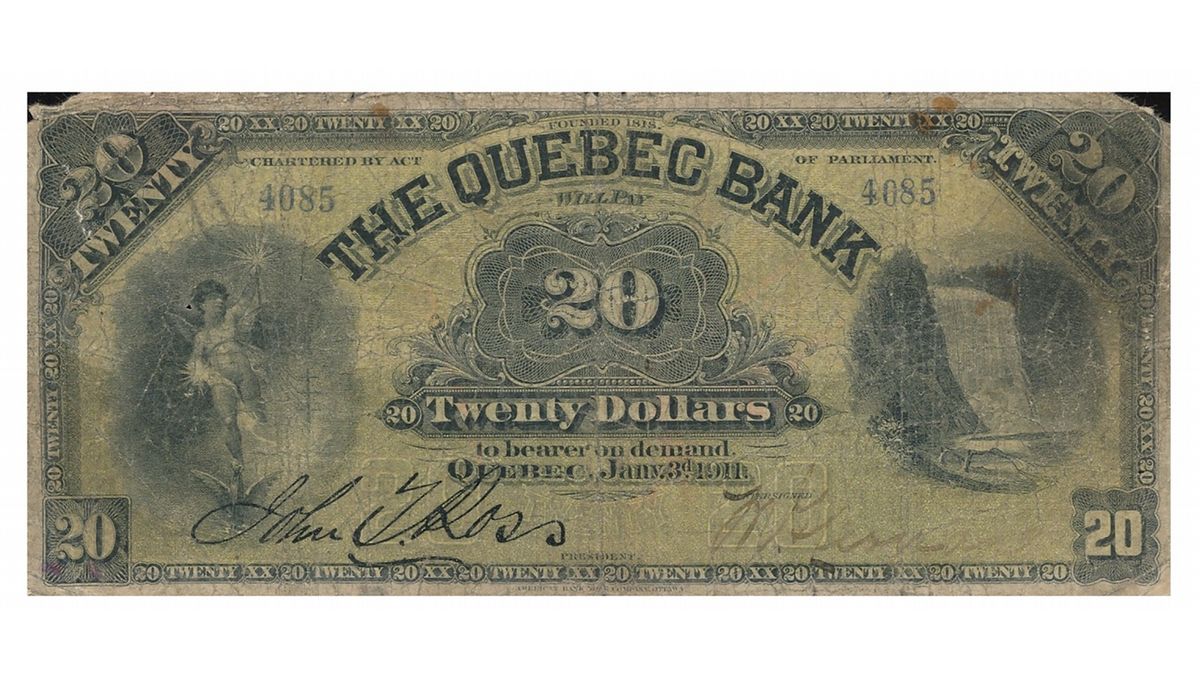 The Quebec Bank 1911 $20 #4085 CH-620-50-06 , VG with rough edges. Catalogued as Intitutional Collection only. The only example seen and known by the cataloguer.