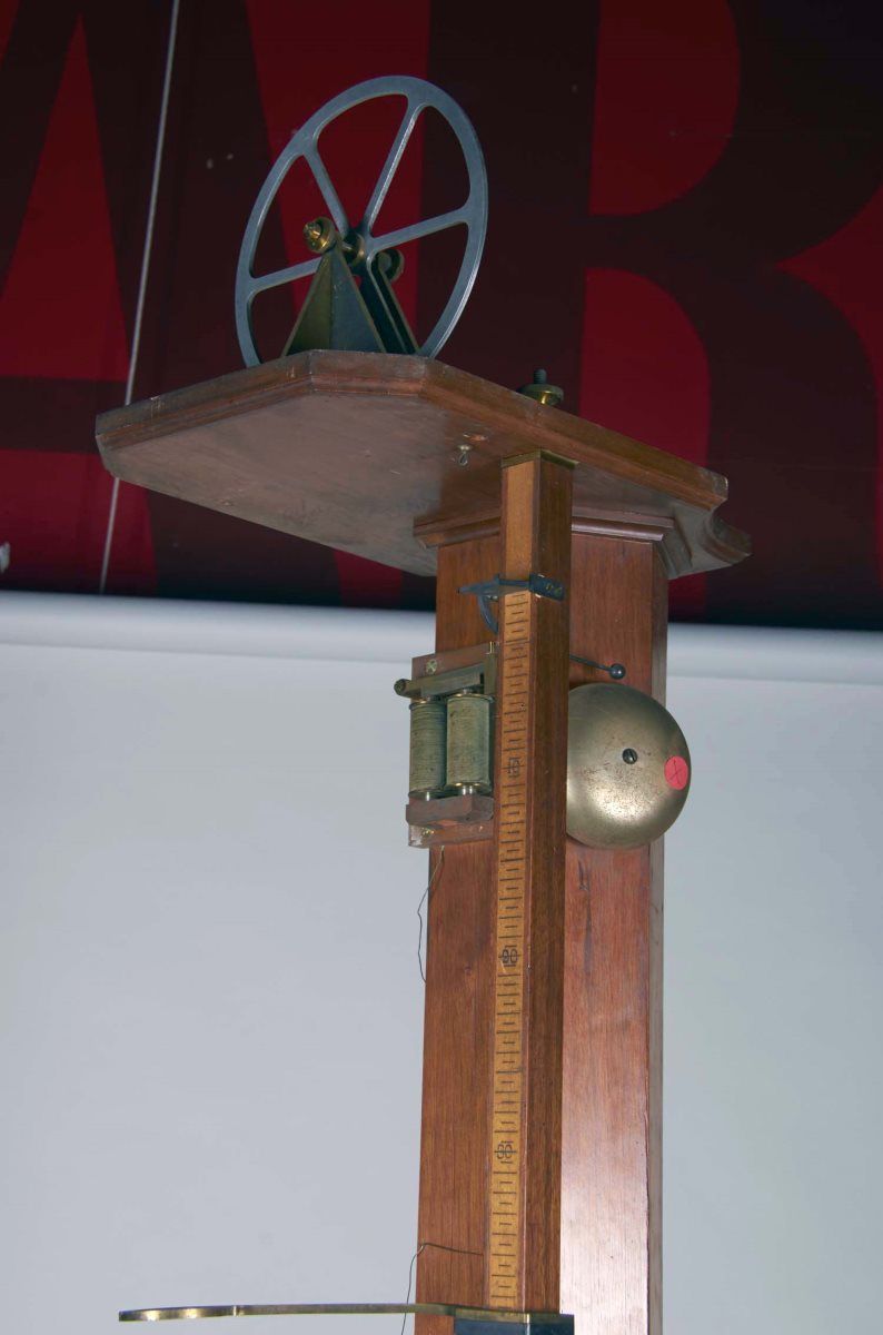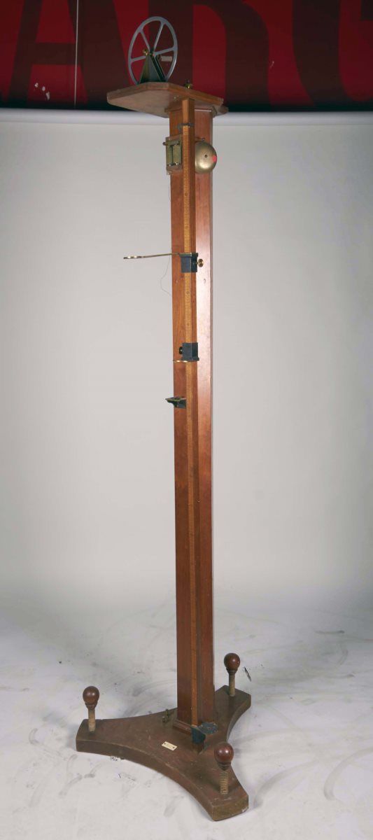 Experimental apparatus used to test the laws of motion, made from strained wood. Appears to be missing cable. Condition (Good). Size Approx. 8" tall