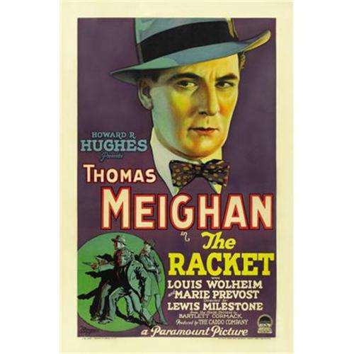 <B>The Racket (Paramount, 1928).</B></I> One Sheet (27" X 41"). Obviously based on the political corruption of Chicago and the mob boss Al Capone, this major crime picture from Paramount would help launch the entire genre that would find popularity with the public during the years of prohibition. Louis Wolheim plays Nick Scarsi (an obvious play on Capone's nickname, Scarface), a tough bootlegger and boss of the underworld in Chicago who meets his match in the incorruptible Officer McQuigg (Thomas Meighan). McQuigg vows to bring Scarsi to justice and in this hard-hitting, bullet-riddled drama, he does just that as Helen (Marie Prevost) comes forward as a witness to murder. The young entrepreneur and multi-millionaire Howard Hughes had a fascination with the gangsters of the era and produced this picture for Paramount as he would later produce the famous film "Scarface" (1932)<I>. </B></I>The film would go on to be nominated for an Oscar as Best Picture. As a side note, the film was long thought lost before being located in Howard Hughes' film collection after his death. The poster has had the borders airbrushed and there were small chips off of three of the corners. There was some color touch to the fold lines and in particular, to the cheek in Meighan's portrait. The restoration is first rate and the poster now appears near mint. Fine on Linen. ****<BR><BR><b>Shipping:</b> Rolled Material (<a target="_blank" href="http://www.heritageauctions.com/common/shipping.php">view shipping information</a>)