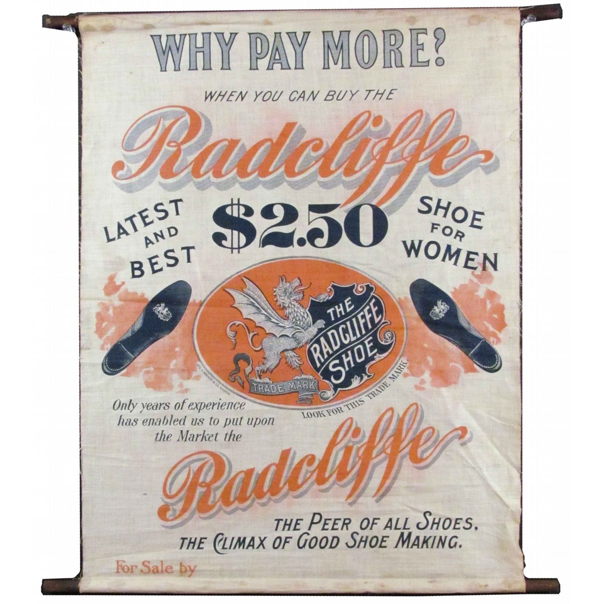 The Radcliffe Shoe Canvas Banner. The Peer of all shoes. The Climax of good shoe making. Original dolls. Some wrinkles and slight discoloration otherwise good condition. 15 X 19 1/2 inches.