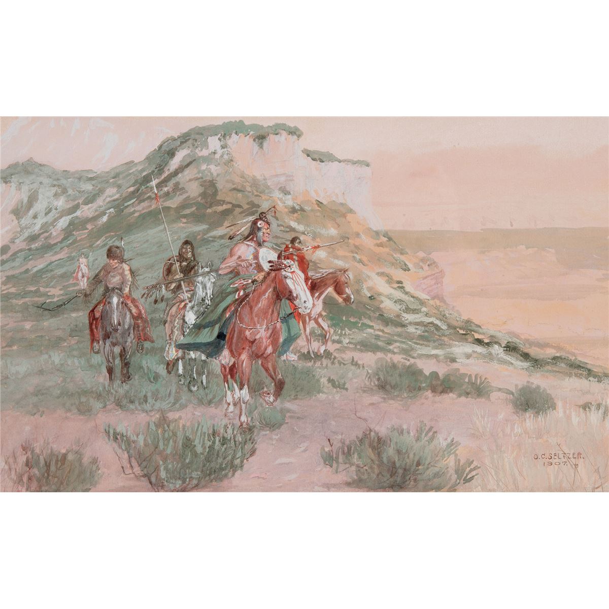 Limiting his palette to reds, greens and whites allows Olaf SeltzerÕs very fine drawing to shine in the exquisite 1907 Gouache, The Raiding Party. With the white faced, exposed bluffs standing sentinel above, seeming as if they, too, are on the lookout for worthy foes and spoils, the party looks in every direction, scouring the valley below, scouting for opportunities. Something in the distance has attracted the attention of the closest rider and the blanketed rider on his left flank. Watching their backs, a fifth warrior in the distance brings up the rear. The effect of the short, choppy stokes of gouache and the mossy grasses on the hillsides frames the pinks and reds so that they have an almost bloody hue. Indeed, these very tough looking warriors are out for blood. Their blood is up, and they taste it.