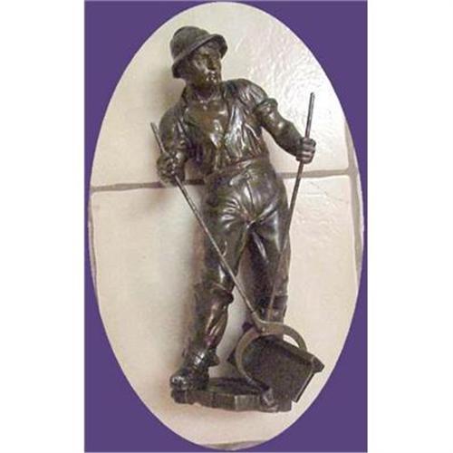 Railroad Worker, Large 15" Sculpture, Cast Metal<P>Title: The Railroad Worker<P>Artist: n/a<P>Age: Vintage<P>Medium: Cast Metal <p>Size: Fabulous Large 15" Sculpture<P>Frame: n/a<P>Condition: Excellent<P>Signature: n/a<P>Notes: This piece is fabulous. It is a vintage cast metal sculpture of a railroad worker laying track. Piece stands 15" tall from the table top, with extraordinary detail and expression. There is a deep chocolate patina to the figure, giving it the look and character of a bronze. The metal, however, is Spelter or Pot Metal. There is no signature or foundry mark on this piece, but one look at the detailing will tell you 'Quality'. The subject, the execution, the condition, and the quality of this figure are all wonderful and sure to please!<P>Please Note: This piece will be accompanied by our Certificate of Authenticity. This piece is covered by our extended 30 day Refund Policy to ensure your complete satisfaction.