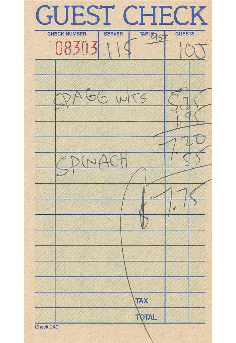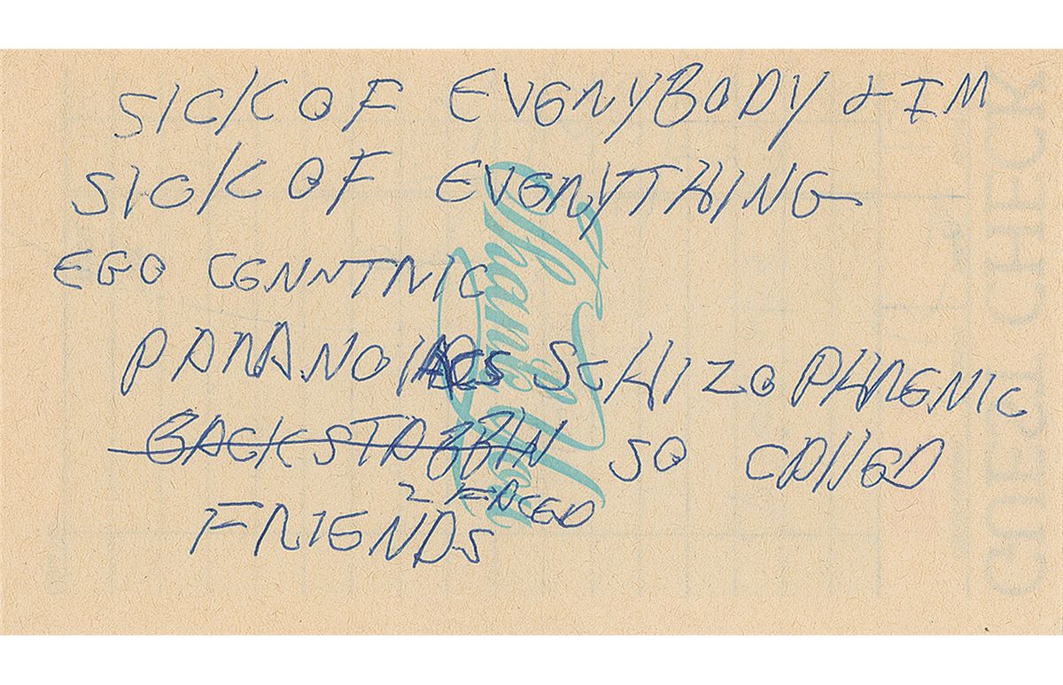 Handwritten lyric fragment for an apparently unpublished song by Joey Ramone. The untitled and unsigned fragment is written on the reverse of a restaurant check for a meal of spaghetti and a side of spinach. Ramone writes, in full (with grammar and spelling retained): “Sick of everybody & I’m / sick of everything / egocenntric / paranoid schizophrenic / backstabbin so called / 2 faced friends.” In fine condition. A great example which shows Joey’s inspiration for writing could happen anytime and anywhere. Accompanied by a letter of authenticity from the Joey Ramone Estate.