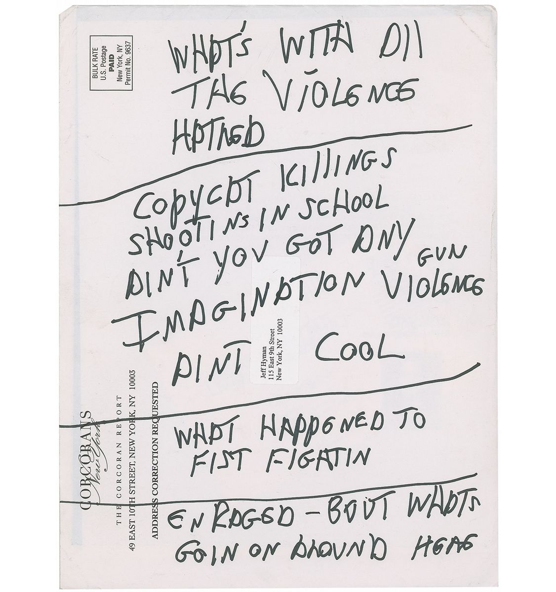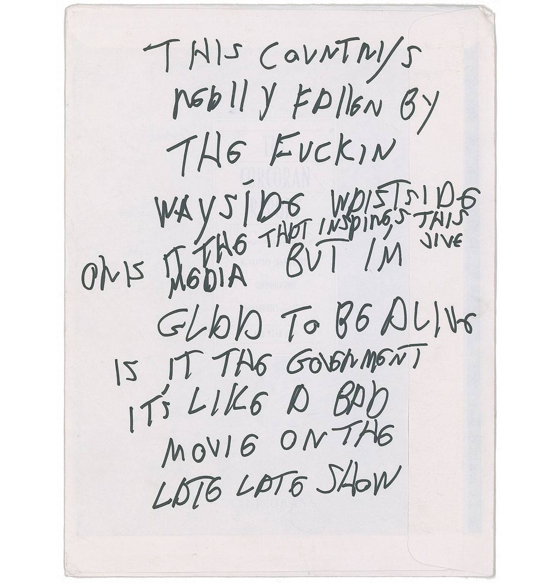Handwritten lyrics to an apparently unpublished song by Joey Ramone. The untitled and unsigned lyrics are written on both sides of a 9 x 12 unopened envelope from from Corcorans of New York, addressed to “Jeff Hyman.” Ramone writes, in full (with grammar and spelling retained): “What’s with all / the violence / hatred / copycat killings / shootings in school / aint you got any / imagination gun violence / aint cool / what happened to / fist fightin / enraged—bout whats / goin on around here / this countrys / really fallen by / the fuckin / wayside / or is it the media that inspires this jive, but I’m / glad to be alive / is it the government / It’s like a bad / movie on the / late late show.” An interesting opinion of Ramone’s on the state of the country. In fine condition. Accompanied by a letter of authenticity from the Joey Ramone Estate.