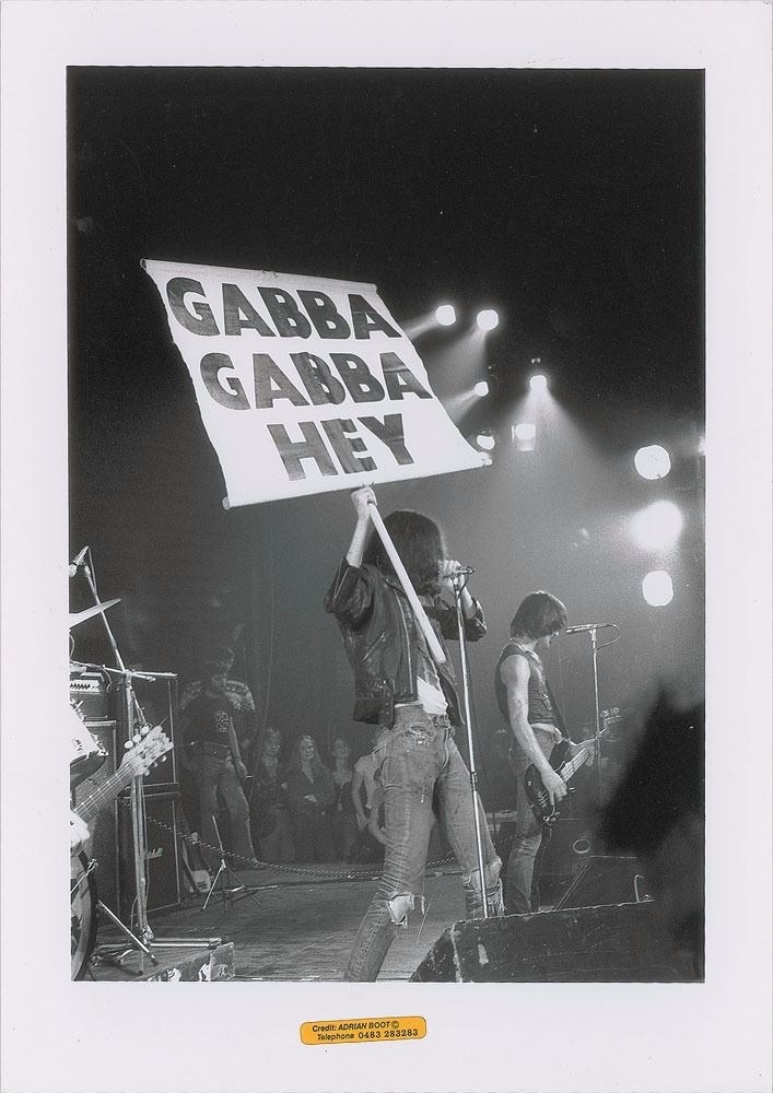 Original glossy 8.25 x 11.75 silver gelatin photo of the Ramones during a performance, showing Joey Ramone holding a large ‘Gabba Gabba Hey’ sign and Dee Dee Ramone playing bass in the background. Lower border bears an Adrian Boot credit label. In fine condition. Boot is one of Britain’s most celebrated music photographers. He was the staff photographer for Melody Maker, and also shot for NME, The Face, The Guardian and The Times (of London). He has photographed a wide variety of musicians, including the Sex Pistols, Clash, Damned, Jimmy Page, Bob Marley & The Wailers, the Grateful Dead in Egypt, and Live Aid. From the Globe Photo archives.