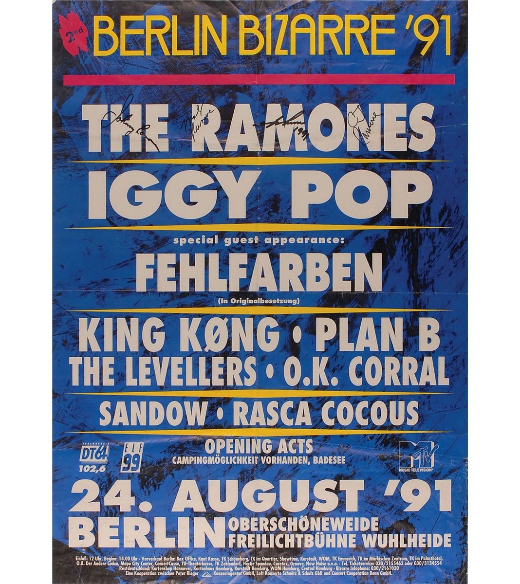 Color 23.25 x 32.5 poster for the 2nd Berlin Bizarre held in Berlin, Germany, in 1991, headlined by the Ramones and Iggy Pop. Signed in black felt tip by Joey, Johnny, Marky, and CJ Ramone. In very good to fine condition, with intersecting storage folds, some edge dings, and scattered creases and wrinkles. Provenance: Joey Ramone Estate. Accompanied by a letter of authenticity from the Joey Ramone Estate.