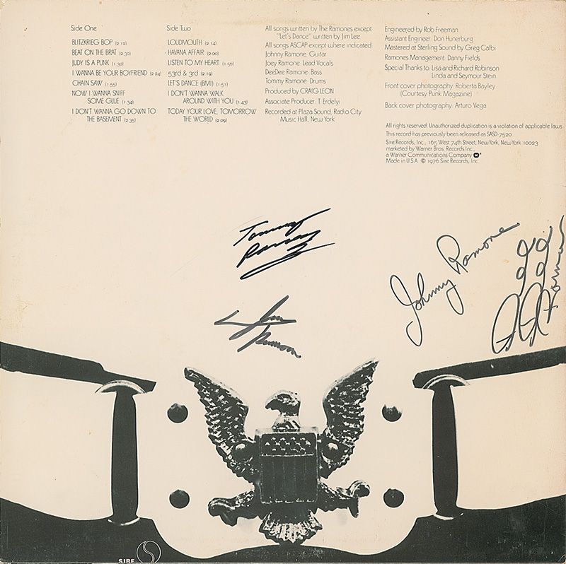Self-titled debut album signed on the back cover in black felt tip by Joey, Johnny, Tommy, and Dee Dee Ramone. In fine condition, with some scattered light wear to covers and edges, a few creases, and a hint of light soiling to back cover. The record is included.