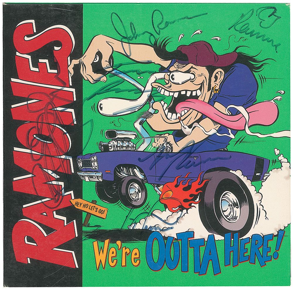 We’re Outta Here! box set consisting of a CD and videocassette, signed on the front cover in felt tip by Joey, Johnny, Dee Dee, Tommy, Marky, and C.J. Ramone. In fine condition, with some light contrast to a few signatures which are also a shade or two light, but all still completely legible. The CD and video are included and still wrapped in their original plastic. Consignor notes all six members held a promotional signing at Tower Records in New York on November 25, 1997, where the signatures were obtained.