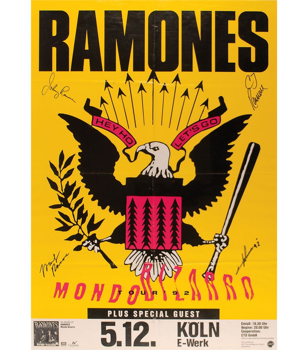 Color 23.25 x 32.5 German promotional poster for their 1992 Mondo Bizarro, signed in black felt tip by Joey, Johnny, Marky, and C. J. Ramone. Storage folds, with horizontal folds passing through small portion of each signature, missing lower corner tips, and a few edge dings, otherwise fine condition.