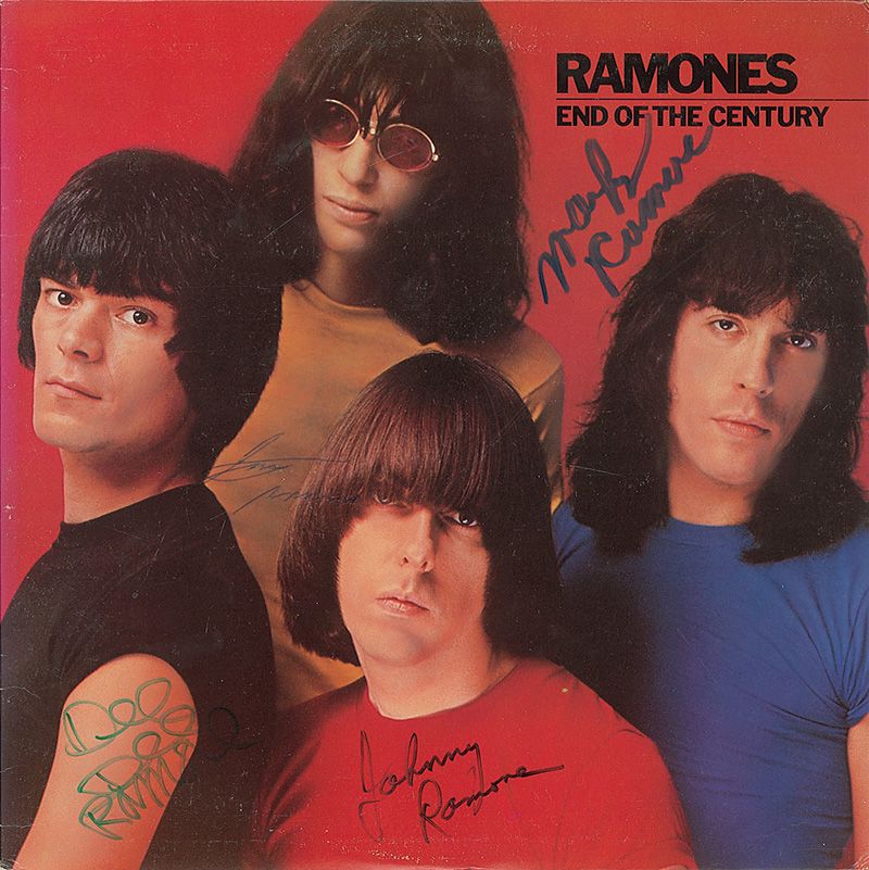End of the Century album signed on the front in felt tip and ballpoint by Joey Ramone, Dee Dee Ramone, Johnny Ramone, and Marky Ramone. In fine condition, with a trivial ‘ring of wear.’ The record is included. The album was signed on April 29, 1980, at Homer’s record store in Omaha, Nebraska, during the Ramones’ End of the Century tour. Accompanied by a letter of provenance from the musician who originally met the band and acquired the autographs.