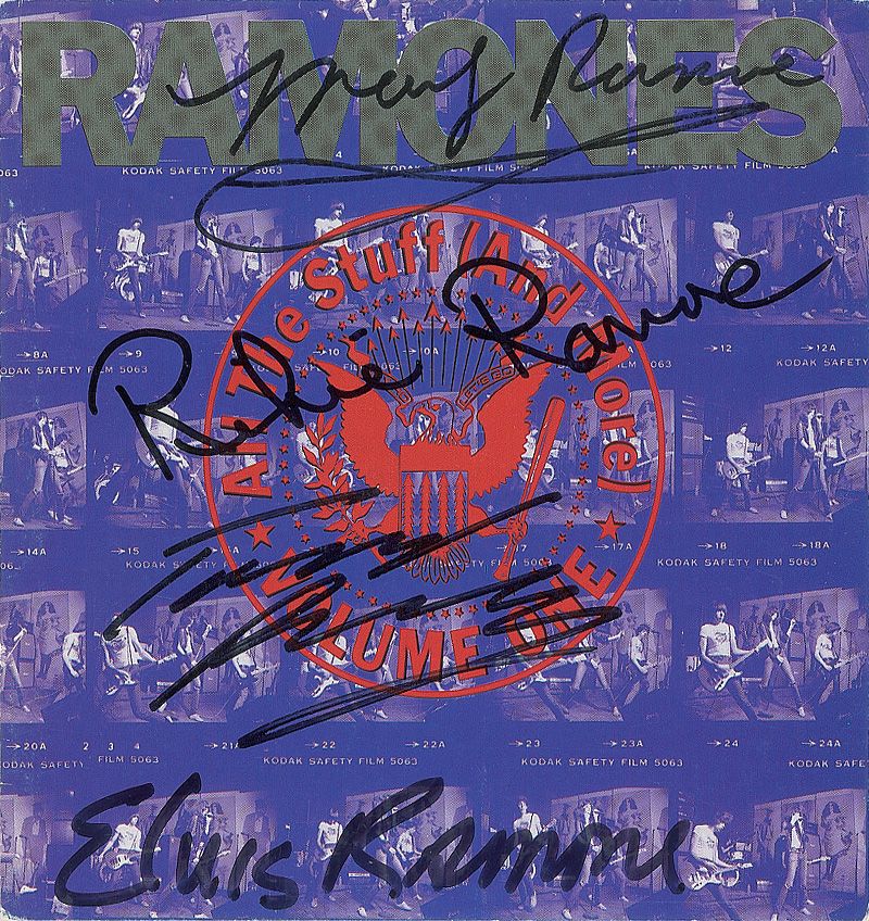 All the Stuff (And More!) Volume 1 CD booklet signed on the front in black felt tip by Marky Ramone, Richie Ramone, Tommy Ramone, and Elvis Ramone. In fine condition.