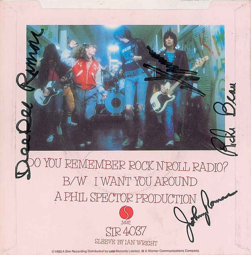 Color 45 rpm record sleeve for ‘Do You Remember Rock 'n' Roll Radio?’ signed on the reverse in black felt tip by Joey Ramone, Dee Dee Ramone, Johnny Ramone, and Richie Beau (Richie Ramone). In fine condition. The record is included. Originally Richie Reinhardt, Richie Ramone adopted the surname ‘Beau’ while in his original band, Velveteen. He used the name only briefly after joining the Ramones in February 1983, making items bearing the ‘Richie Beau’ signature quite scarce.