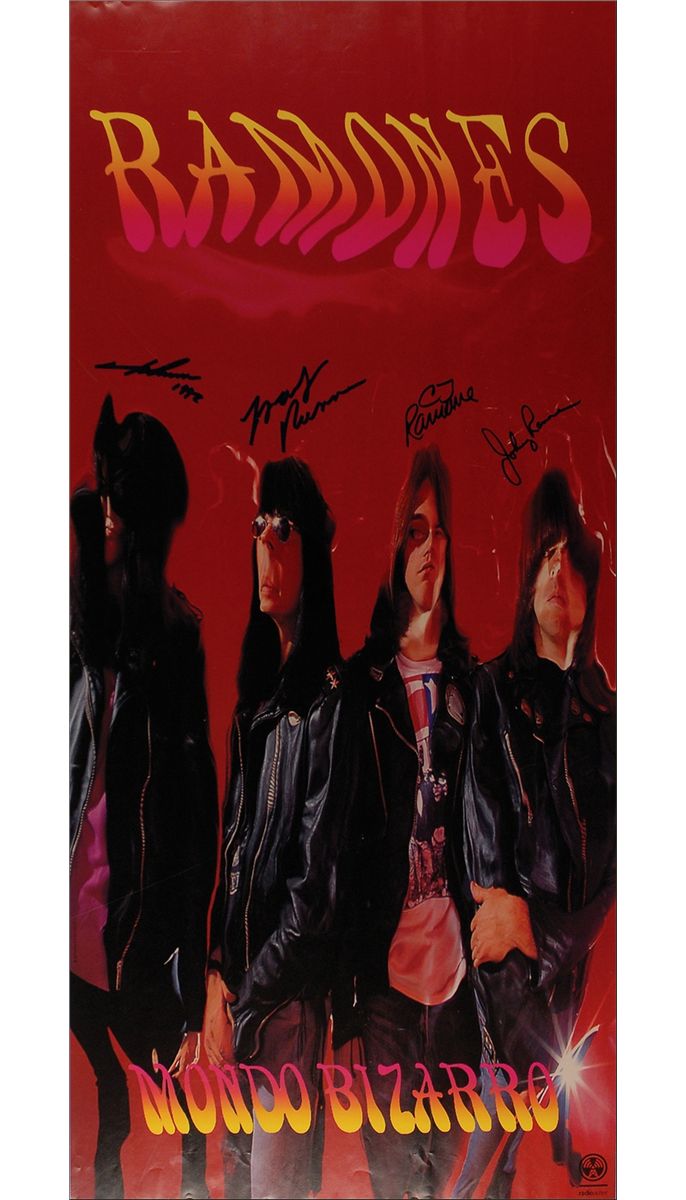 Color 16.25 x 36 poster entitled Mondo Bizarro, signed in black felt tip by Joey Ramone, Marky Ramone, C. J. Ramone, and Johnny Ramone. Rolled and in fine condition, with scattered creases and edge dings.