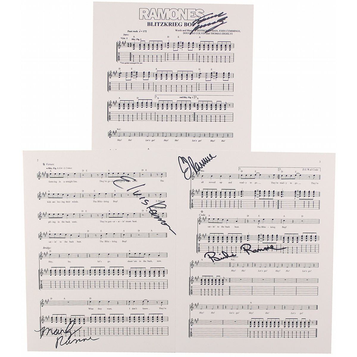 Sheet music to ‘Blitzkrieg Bop’ on three white 8.5 x 11 cardstock sheets, signed on the sheets in black felt tip by Tommy, Elvis, Marky, C. J., and Richie Ramone. In very fine condition.