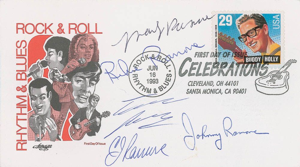 FDC with a cachet honoring rock and roll and rhythm and blues, signed in blue and black ballpoint by Johhny, Tommy, Marky, Richie, and CJ Ramone. In fine condition.