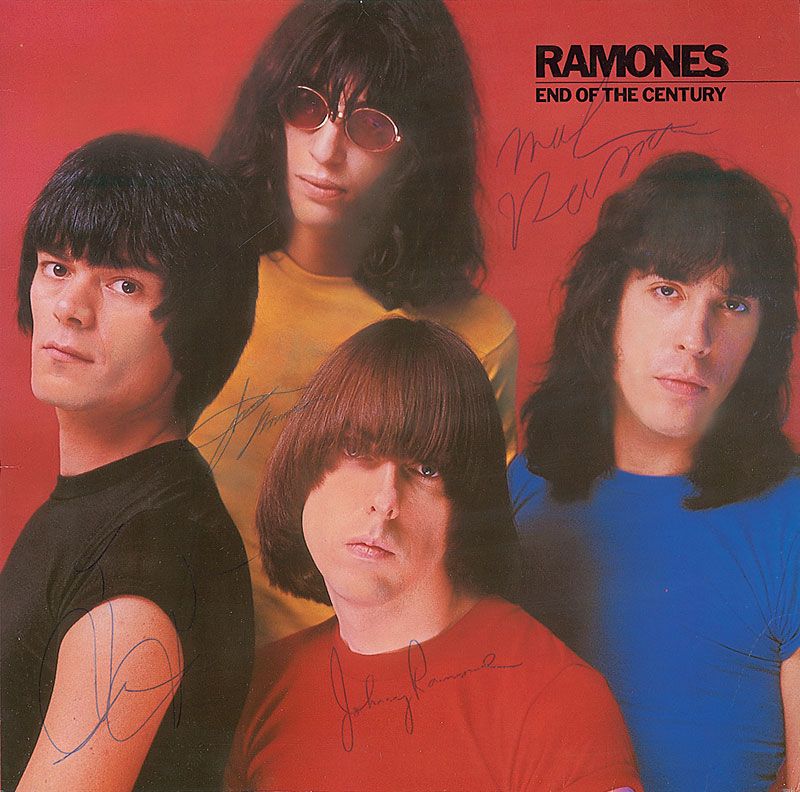 End of the Century album signed on the front cover in blue ballpoint by Joey, Johnny, Marky, and Dee Dee Ramone. In fine condition, with a few light surface marks and a crease to lower right of front cover. The record is included. Accompanied by a letter of provenance from the friend of the original recipient stating that the signatures were acquired in Offenbach, Germany on November 22, 1989.