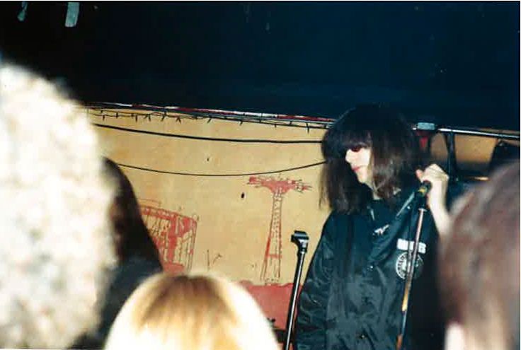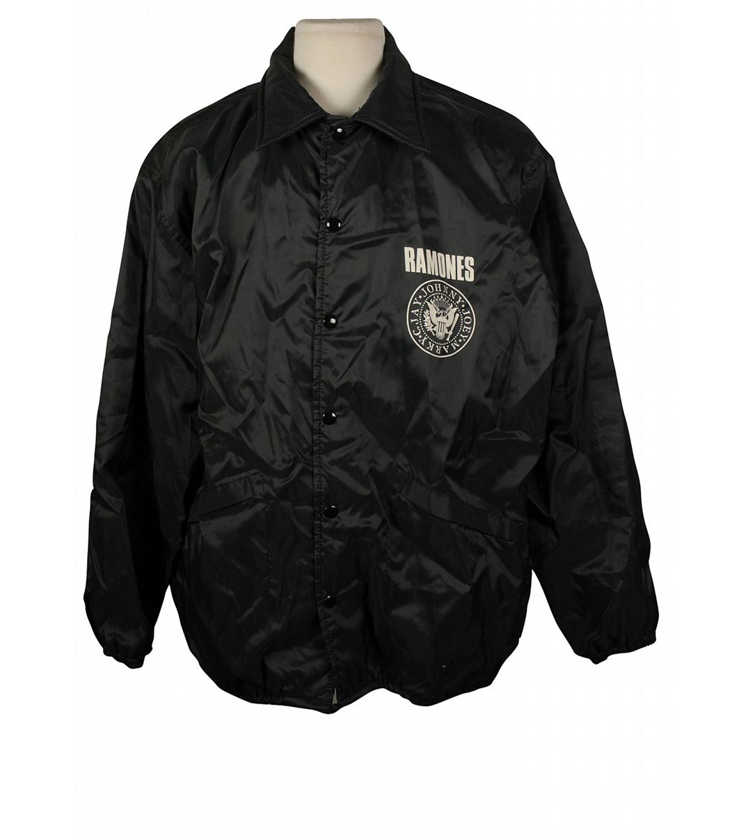 Joey’s stage-worn black nylon shell Ramones jacket, size XL, made by Dunbrooke. Jacket features a small eagle insignia printed on the left breast with the band’s name above, with a larger eagle insignia on the reverse, with the band’s name printed in red letters above. In fine condition. Provenance: Joey Ramone Estate. Accompanied by a letter of authenticity from the Joey Ramone Estate, as well as two candid photos of Ramone on stage wearing the jacket.