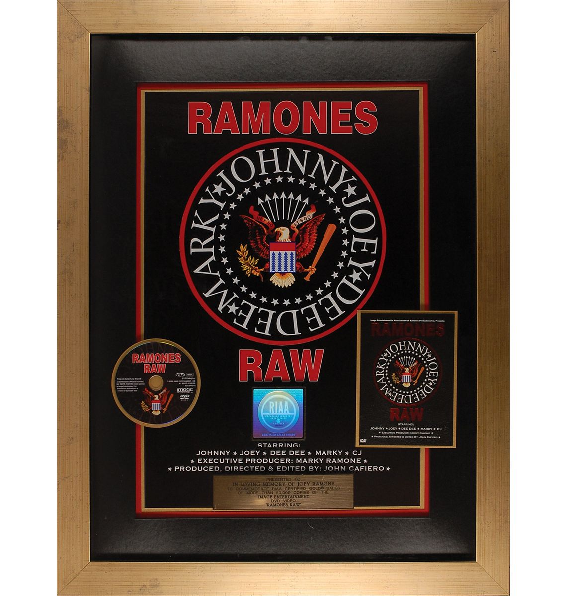 Official RIAA hologram gold sales award presented posthumously to Joey Ramone for the Ramone’s DVD Raw. Presentation plaque reads, “Presented in loving memory of Joey Ramone to commemorate RIAA certified gold sales of more than 50,000 copies of the Image Entertainment DVD Video ‘Ramones Raw.’” Above the plaque is an image of the cover art, a copy of the DVD, and a Ramones eagles insignia. All are triple-matted and framed to an overall size of 25.5 x 33.5. In fine condition. Provenance: Joey Ramone Estate. Accompanied by a letter of authenticity from the Joey Ramone Estate.