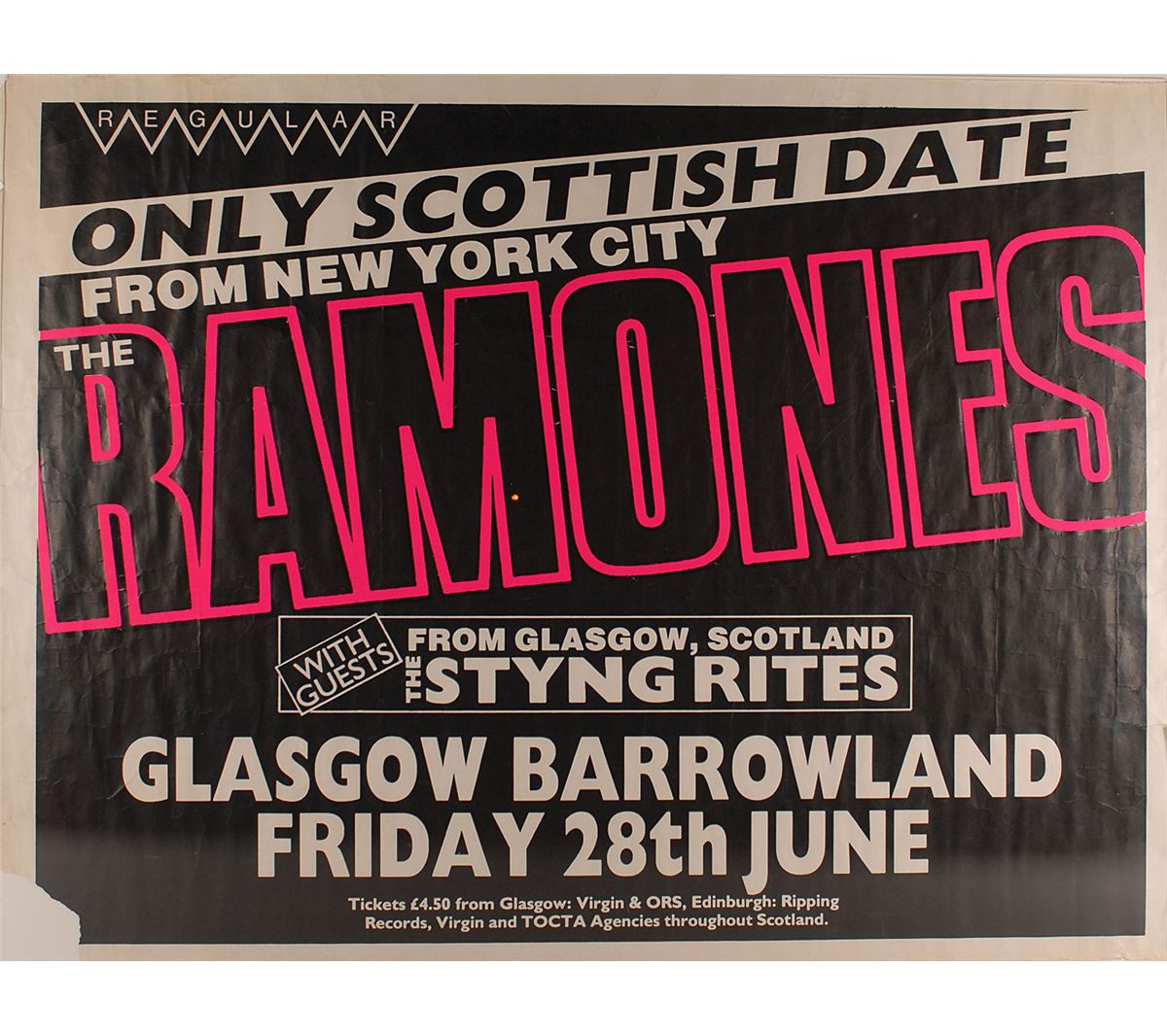 Color 30.25 x 40.25 promo poster for The Ramones concert in Glasgow, Scotland, at the Glasgow Barrowland Ballroom on June 28, with special guest the Styng Rites. In good condition, with light overall creases, several edge tears, and missing lower left corner. Provenance: Joey Ramone Estate. Accompanied by a letter of authenticity from the Joey Ramone Estate.