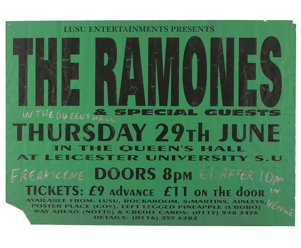 Original color 23 x 16.25 promotional poster for The Ramones concert in The Queen’s Hall at Leicester University on June 29. Several additional notations about the show have been added in silver ink in an unknown hand. Moderate overall creasing and wrinkling, a few edge tears, and missing lower left corner, otherwise very good condition. Provenance: Joey Ramone Estate. Accompanied by a letter of authenticity from the Joey Ramone Estate.