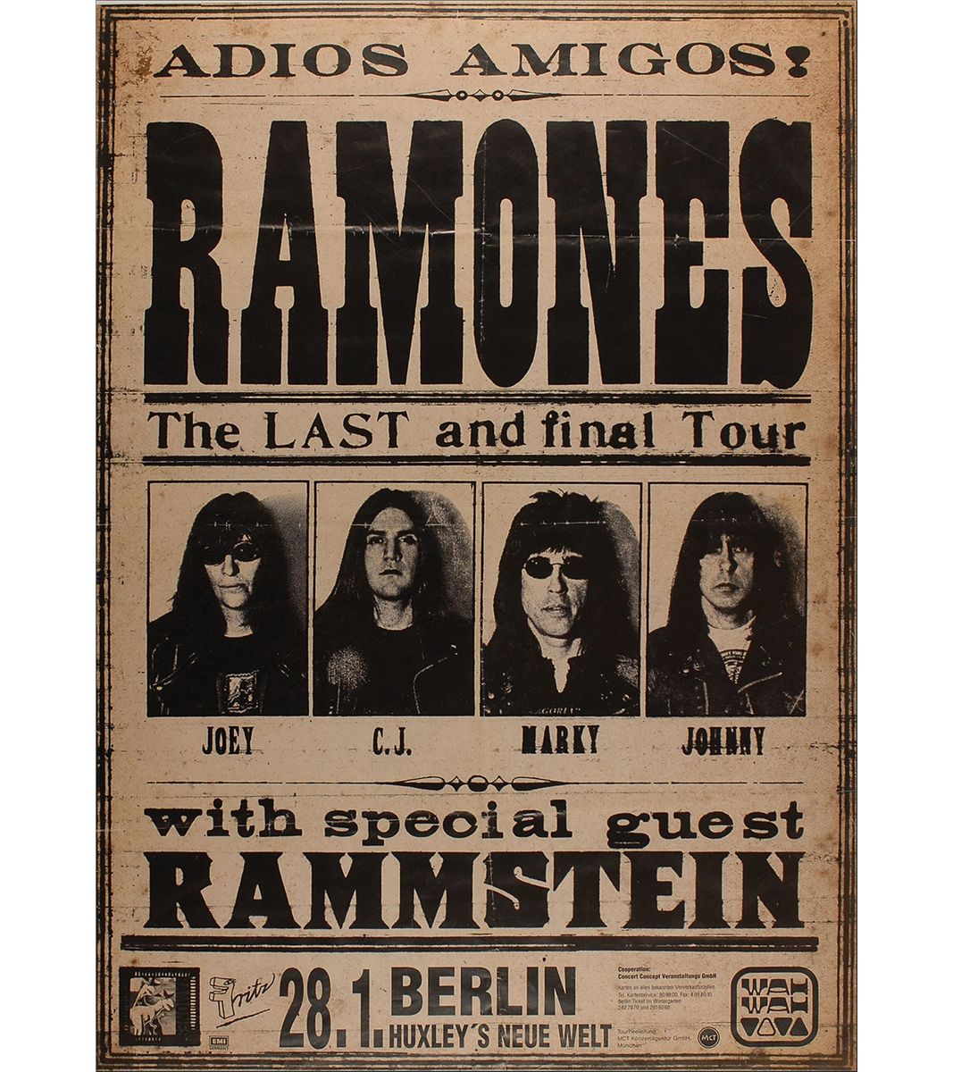 Adios Amigos promotional tour poster, 23.25 x 33, for the band’s farewell tour stop in Berlin, Germany, featuring images of Joey, Marky, Johnny, and C. J. Ramone. Previous intersecting storage folds, scattered wrinkles and creases, and a few small edge tears, otherwise very good condition. Rolled. Provenance: Joey Ramone Estate. Accompanied by a letter of authenticity from the Joey Ramone Estate.