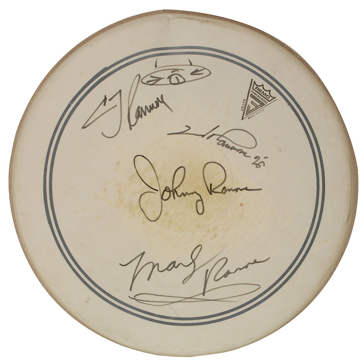 Used 14? Remo Powerstroke 3 coated drumhead, signed in black felt tip by Joey, Johnny, Marky and CJ Ramone, with CJ adding a small sketch and Joey dating his signature “’96.” Expected use from wear, otherwise fine condition. Provenance: Joey Ramone Estate. Accompanied by a letter of authenticity from the Joey Ramone Estate.