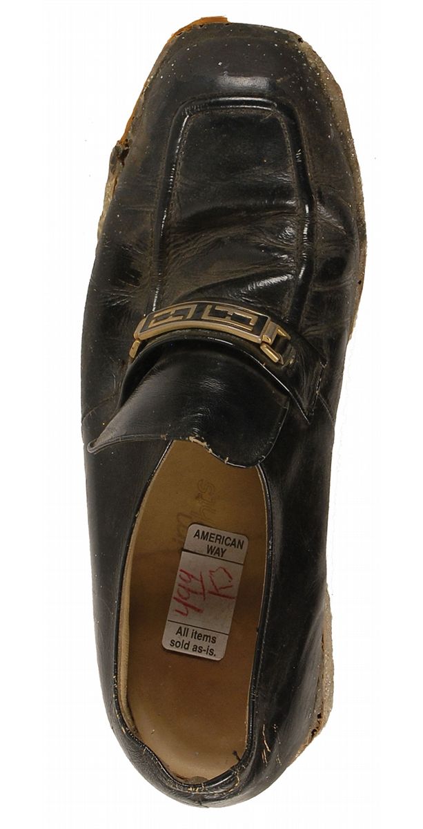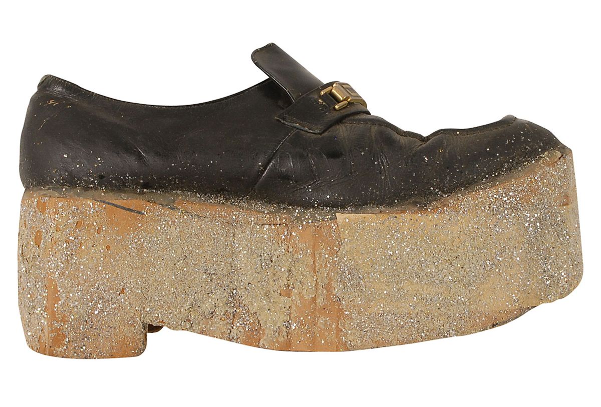 Platform shoe prop seen in both cuts of the Ramone’s Substitute video, created from a leather shoe, cardboard, and glitter. This shoe served as a cutaway shot for the verse: ‘I look pretty tall but my heels are high.’ In very good condition, with some parts of the cardboard sole bent and creased. All Ramones band members were present on set when this prop was used. Provenance: Tom Rainone.