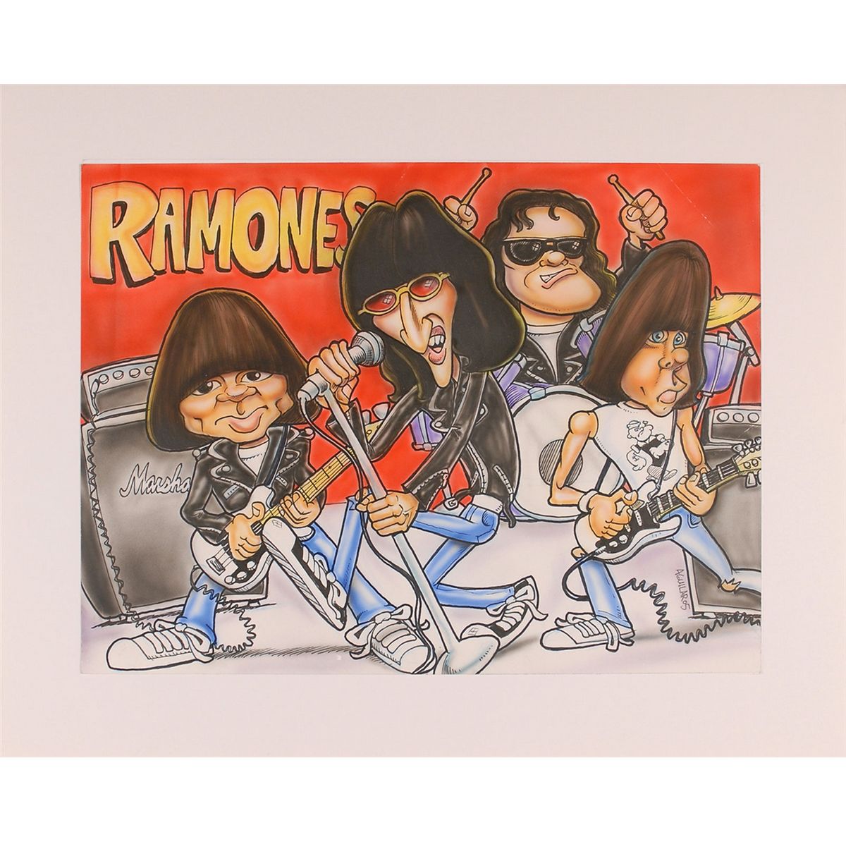 Original hand-drawn color artwork for a South American bootleg live Ramones album, 16 x 12, signed vertically in the lower right, “Aguilar ’05.” Mounted on a piece of foam board to an overall size of 20 x 16 and nicely framed. In fine condition.