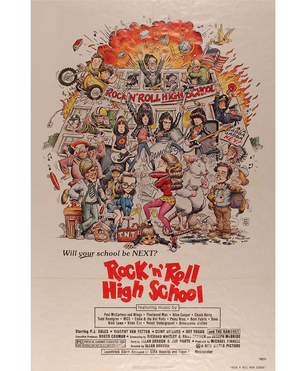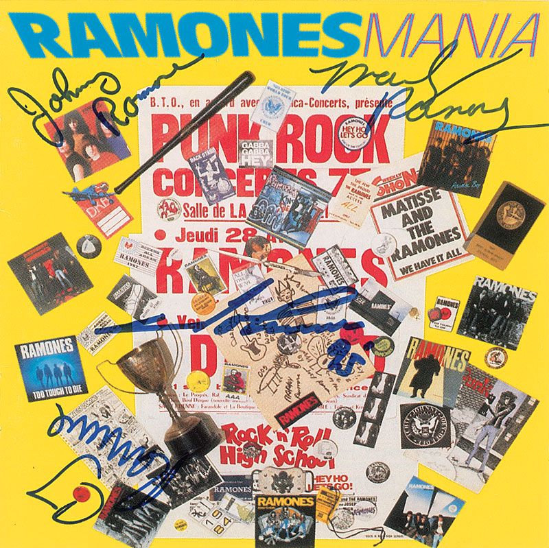Ramones Mania CD sleeve, to one of their most successful releases, boldly signed on the front cover in blue and black felt tip by Joey Ramone, Johnny Ramone, Marky Ramone, and CJ Ramone, and dated 1995 by Joey. Signatures present nicely: bold, sharp, and clear; this is the first time we have offered this particular CD signed by the band. Accompanied by a first release 27 x 41 one-sheet movie poster for the 1979 Roger Corman film Rock ’n’ Roll High School. CD sleeve in very fine condition; poster in very good to fine condition, with light overall wrinkling, some light soiling, minor tack holes to corners, and a trivial tear to top. Both items originate from Tom Rainone (producer/director of The Ramone's Substitute video), with the poster coming directly from Johnny Ramone in the early 1990s. This dual offering would make for a fantastic Ramones display piece!