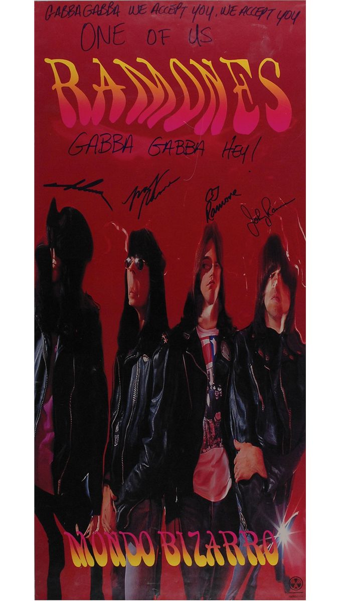 Color 16.5 x 36 poster for Mondo Bizarro, signed in blue felt tip by Joey, Marky, CJ, and Johnny Ramone. Two lines of the Ramones’ song ‘Pinhead’ have been added at the top of the poster by CJ Ramone. Rolled and in fine condition.