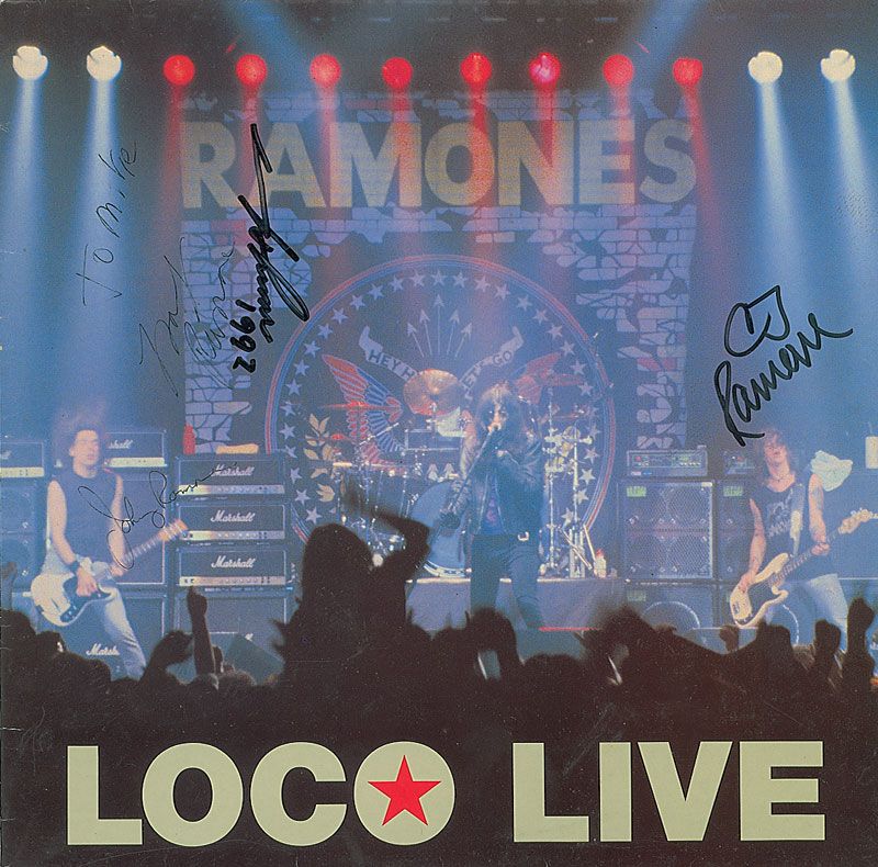 Loco Live album signed on the front cover in black felt tip by Joey and CJ Ramone and in black ink by Johnny and Marky Ramone, who adds a brief inscription to Mike. In fine condition, with some scattered light edge creases. The record is included.