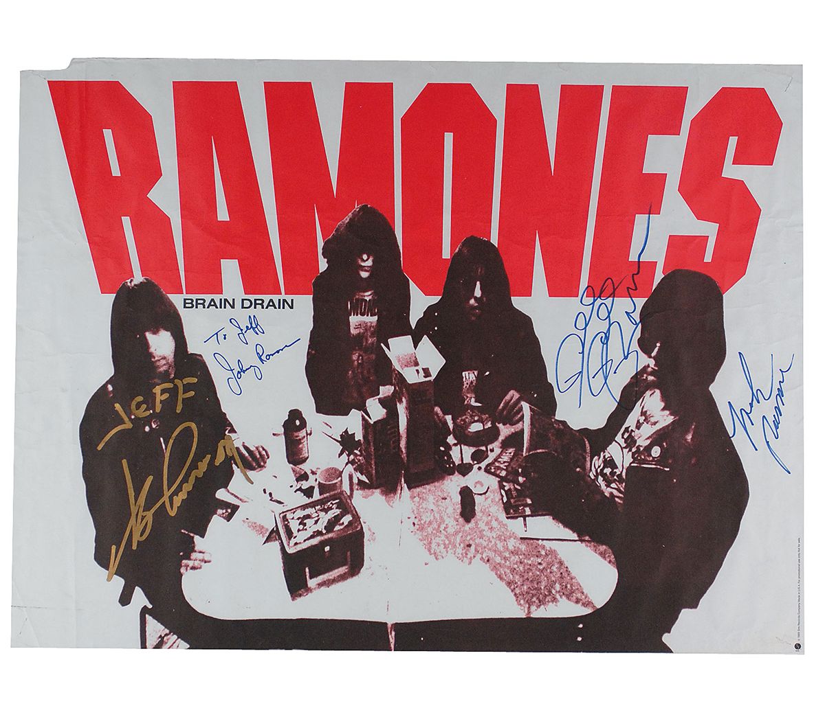 Color 24 x 18 poster for Brain Drain, signed and inscribed in gold ink by Joey Ramone, and in blue felt tip by Johnny (ins), Dee Dee, and Marky Ramone. Rolled and in very good condition, with scattered light creases.