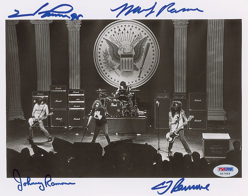 Glossy 10 x 8 photo of the Ramones on stage, signed in the borders in blue felt tip by Joey, Johnny, Marky, and CJ Ramone. Diagonal crease to right side of the photo (affecting no signatures), otherwise fine condition. Accompanied by certificates of authenticity from Roger Epperson/REAL and PSA/DNA.