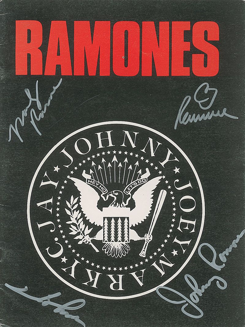 Ramones tour program from their 1995 final tour, 9.75 x 13, signed on the front cover in silver ink by Joey, Johnny, Marky, and CJ Ramone. In fine condition, with some mild handling wear.