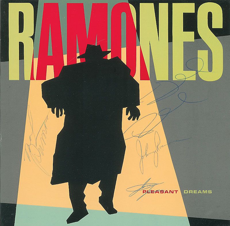 Pleasant Dreams album signed on the front cover in blue ballpoint by Joey, Johnny, Dee Dee, and Marky Ramone. In fine condition. The record is included. Album was signed in 1981 during their Pleasant Dreams tour.
