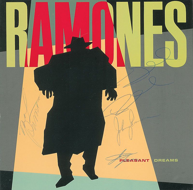Pleasant Dreams album signed on the front cover in blue ballpoint by Joey, Johnny, Dee Dee, and Marky Ramone. In fine condition. The record is included. Album was signed in 1981 during their Pleasant Dreams European tour.