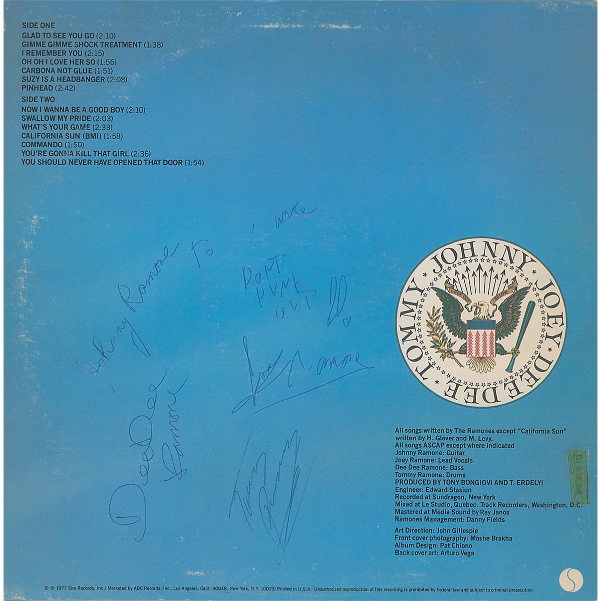 Leaving Home album signed and inscribed on the back cover, “To Lance, Don’t punk out!! Joey Ramone,” “Johnny Ramone,” “Dee Dee Ramone,” and “Tommy Ramone.” In fine condition, with some light wear to covers, small old tape remnant to back cover, and Johnny writing over a first attempt at his name. The record is included. Signatures were obtained in 1977 at Randy’s Rodeo in Texas on the Ramones’ third tour. Accompanied by six original color candids of the band’s performance at Randy’s Rodeo.