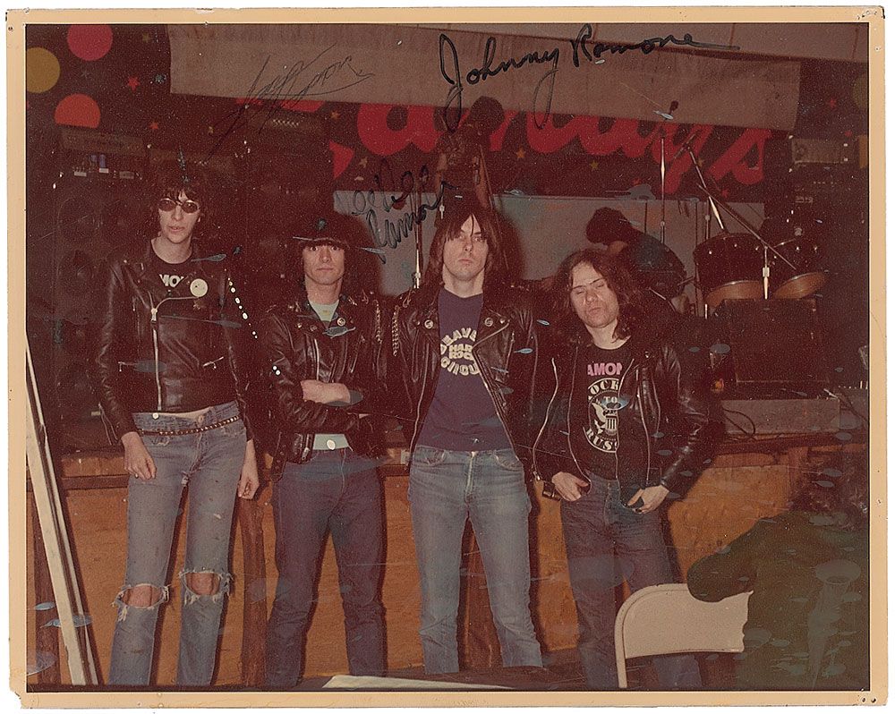 Unpublished color vintage satin-finish 10 x 8 photo of the Ramones posing in front of the stage at Randy’s Rodeo in Texas in 1977 taken by Lindell Tate, signed in black felt tip by Johnny and Dee Dee Ramone, and in black ballpoint by Joey Ramone. A few tack holes to corners and spotting to image, heavier to bottom portion, and Joey’s signature a couple shades lighter than the others, otherwise fine condition. Accompanied by a copy of a letter of authenticity from the photographer, Lindell Tate.