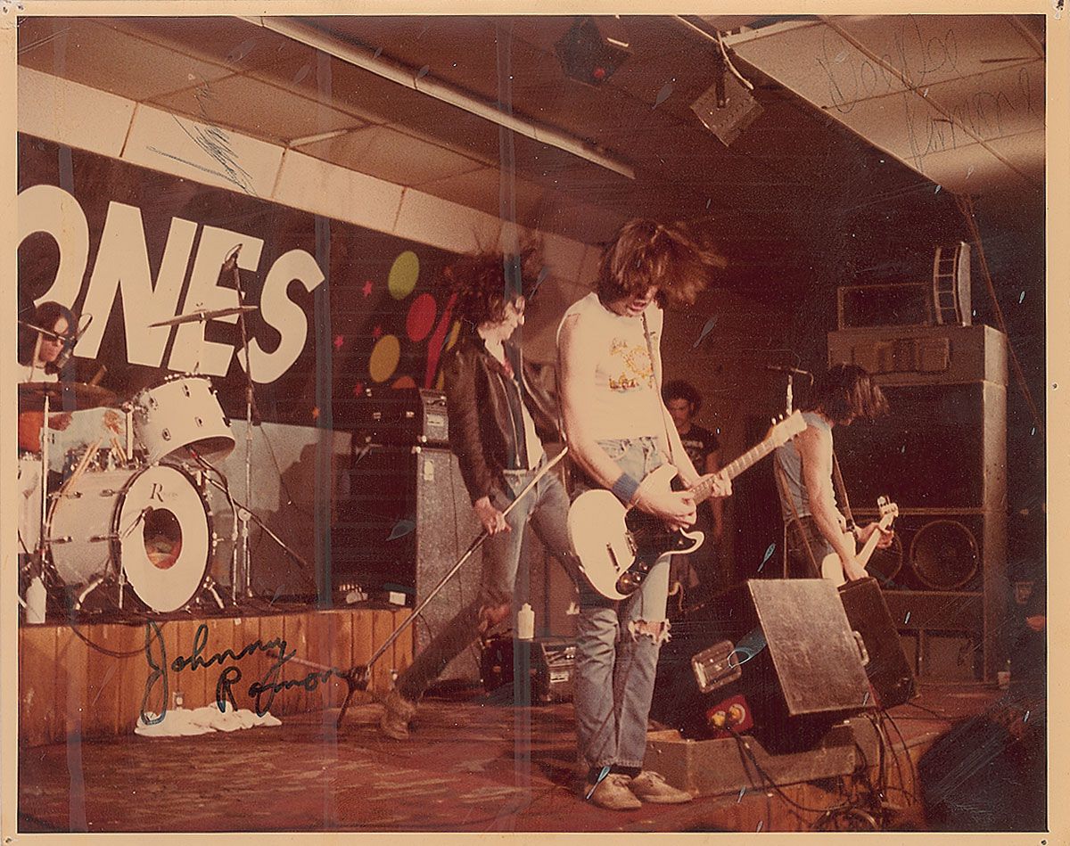 Two unpublished color satin-finish photos of original members on stage at Randy’s Rodeo in Texas in 1977, an 8 x 10 of Tommy Ramone behind his drum kit, signed in black felt tip; and a 10 x 8 of the entire band in action, signed in black felt tip by Johnny Ramone and in blue ballpoint by Dee Dee and Joey Ramone. A single tack hole to each corner, Dee Dee and Joey’s signatures light, but still legible, and spotting to both images, otherwise fine condition. Accompanied by a copy of a letter of authenticity from the photographer, Lindell Tate.