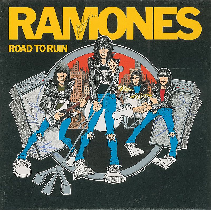 Road to Ruin album signed on the front cover in blue ballpoint by Joey, Johnny, Dee Dee, and Marky Ramone, with Marky using the printed “M” in the album title for the first letter of his signature. In fine condition. The record is included. All signatures were obtained in 1980.