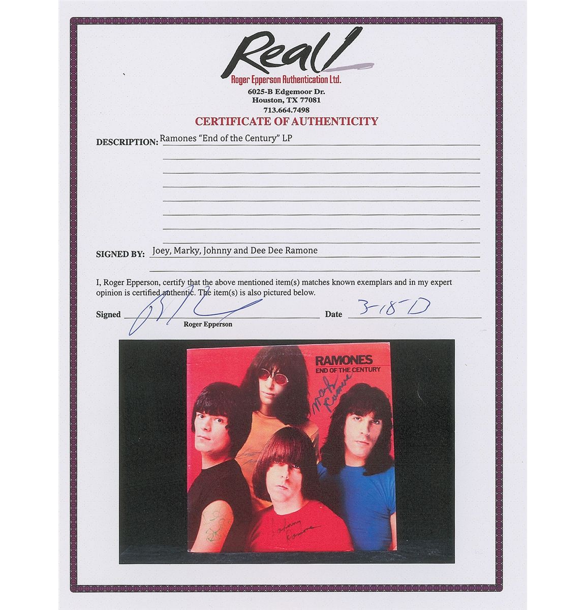 End of the Century album signed on the front in felt tip and ballpoint by Joey Ramone, Dee Dee Ramone, Johnny Ramone, and Marky Ramone. In fine condition, with a trivial ‘ring of wear.’ The record is not included. The album was signed on April 29, 1980, at Homer’s record store in Omaha, Nebraska, during the Ramones’ End of the Century tour. Accompanied by a full letter of authenticity from Roger Epperson/REAL.