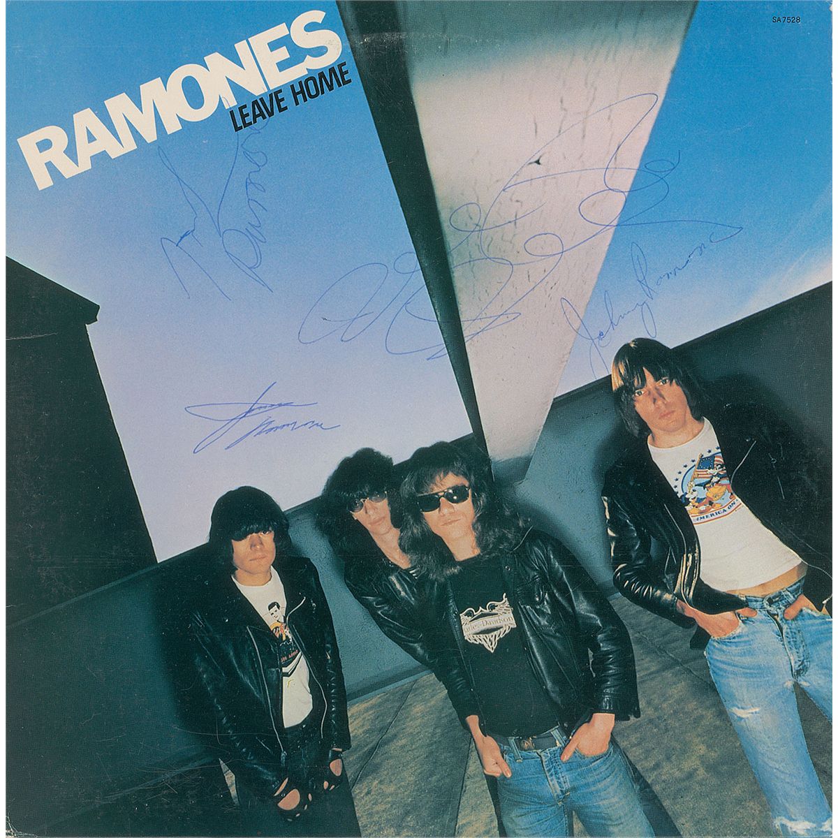 Leave Home album signed on the front cover in blue ballpoint by Johnny, Joey, Dee Dee, and Tommy Ramone. In fine condition, with a few edge creases and corner tip dings. The record is included.